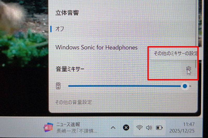 「音量ミキサーを開く」もしくはトップ画像のようにサウンドマークを左クリックして、歯車マークの「その他のミキサー設定」ででると思います。