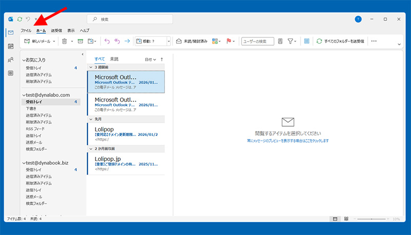 test@dynalabo.comはメール全体、受信トレイであればそれだけ。