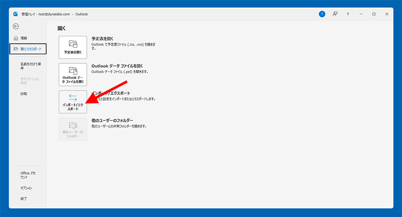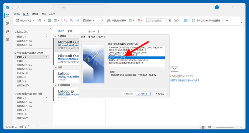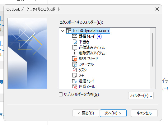 今回はメールのデータ全部(受信トレイ、送信トレイ、送信済みなど)をエクスポートします。