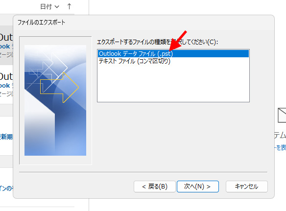 Outlookデータファイル(.pst)を選びます。「次へ」