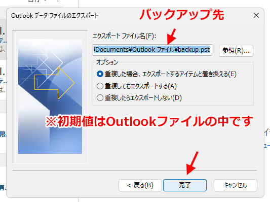 エクスポート(バックアップ)先を選びます。そのままであればドキュメントの下の「OUTLOOKファイル」の中に生成されます。