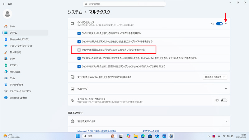 「ウィンドウを画面上部にドラッグした時にスナップレイアウトを表示する」ボタンを解除してください。