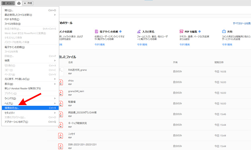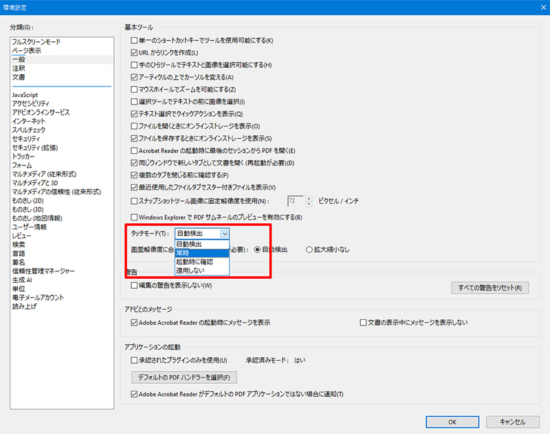 PDFファイルを開いた時に常に手のひら(ドラッグツール)の状態にしておきたい 2025.10.02 ソフトウェア関連 ◆免責事項を読んでご利用ください◆ 利用上の注意点はじめにこの高度なIT社会ではインターネットを介しての情報発信が非常に厳しく規制されています。その中でこのサイトがどのような影響を及ぼすか判断できません。従って、利用する方は必ず、下記の点だけ理解して頂き利用ください。問合せ・クレーム等につ続きを読む 手のひらツール PDFファイルを開いた時に通常はポインターは「矢印」だと思います。 「手のひら」にしたい方がいると思います。その場合は下記の設定で可能です。 「メニュー」の「環境設定」 「一般」→「タッチモード」を「自動検出」→「常時」にすればよいです。 以上