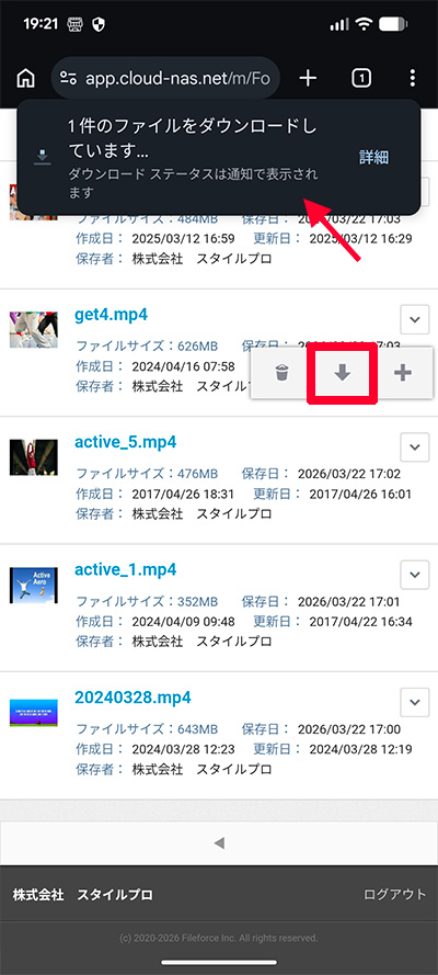 右側のプルダウンアイコンをタップすると下記のマークになりますので、(↓)ダウンロードマークをタップしてください。